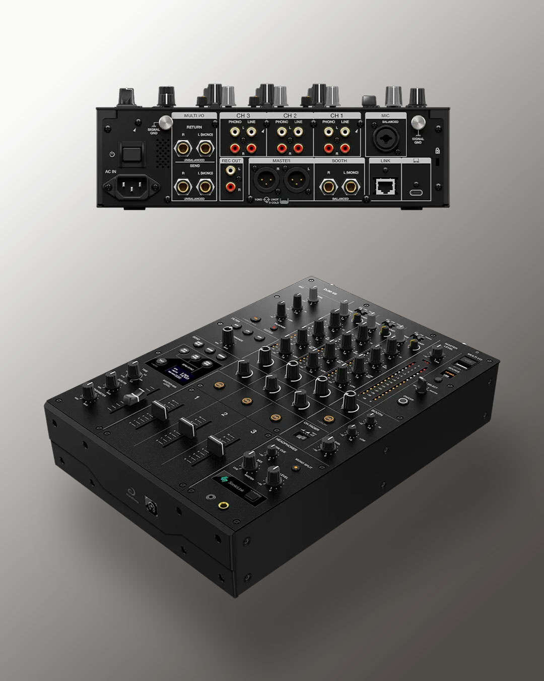 A conectividade também é um ponto forte. O mixer dispõe de USB Tipo-C, suporte a PRO DJ LINK, integração total com softwares de DJ e compatibilidade com setups DVS. Além disso, oferece entradas e saídas flexíveis para efeitos externos, gravação, streaming e utilização com dispositivos móveis.